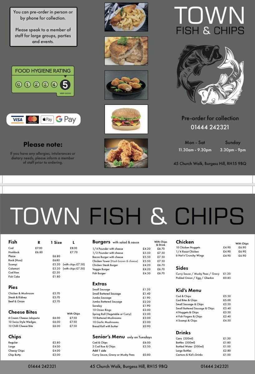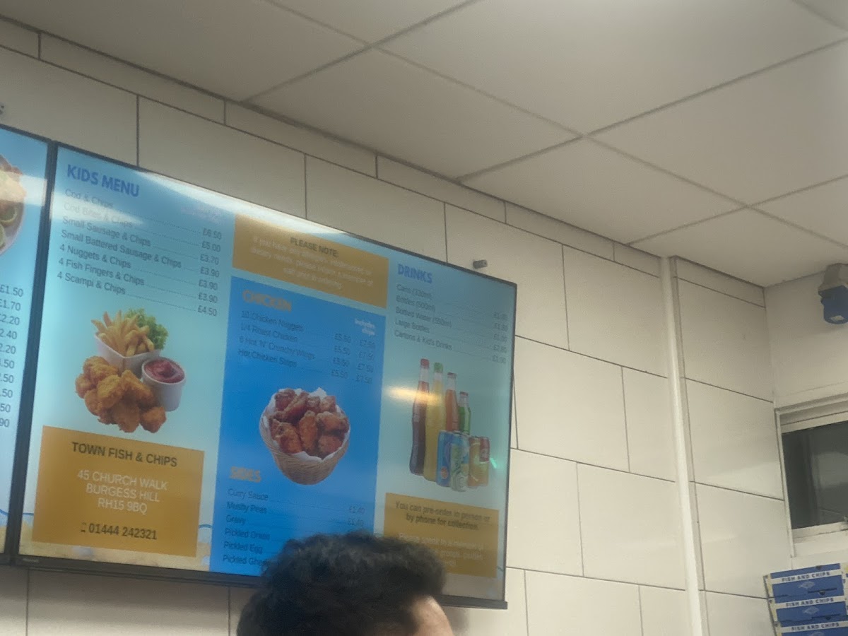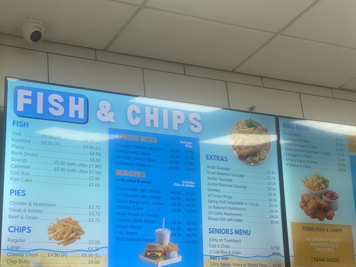 From a reviewer’s perspective, the menu at Town Fish & Chips offers a classic and satisfying selection that covers all the traditional favourites you would expect from a British chippy. The fish options like Cod, Haddock, Plaice, Rock, and Scampi form the heart of the menu, while comforting pies such as Chicken & Mushroom, Steak & Kidney, and Beef & Onion add hearty alternatives. There’s also a good range of sides and snacks, including 6 Cream Cheese Jalapeño, 10 Swiss Style Wedges, and 10 Chilli Cheese Bite, plus filling burger choices like 1/4 Pounder With Cheese, 1/2 Pounder With Cheese, Bacon Burger With Cheese, Chicken Tower, and Chicken Steak Burger. The menu is rounded out with extras like Small Sausage, Jumbo Battered Sausage, and Saveloy, as well as family-friendly options such as Cod & Chips, Cod Bites & Chips, and 4 Nuggets & Chips. With additional comfort items like Cheesy Chips and Chip Butty, the menu feels complete, varied, and well-suited for both quick takeaway meals and satisfying comfort food cravings.